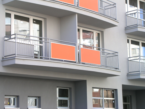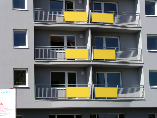 CETRIS desky použité jako výplně balkónových zábradlí. Tl.desky CETRIS FINISH 16mm. Tři barevné odstíny dle Ral vzorkovníku.