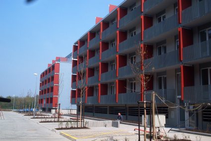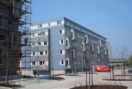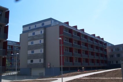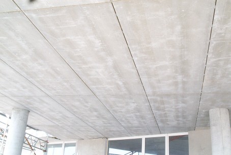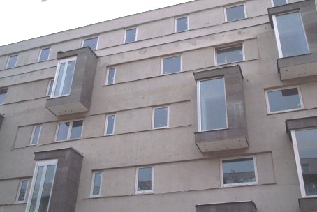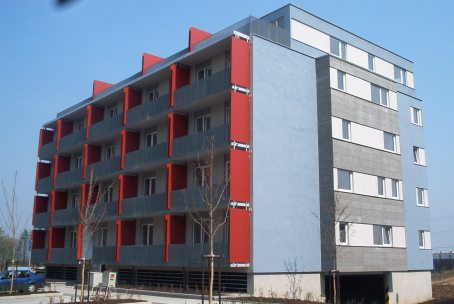 V odvětraném fasádním systému byly užity k opláštění cementotřískové desky CETRIS BASIC tl. 12 mm. Tyto desky byly (na přání autora projektu) ponechány v přírodním šedocementovém odstínu a ošetřeny transparentním hloubkovým nátěrem. Desky CETRIS jsou navzájem kladeny v tzv. systému VARIO – s přiznanou svislou a vodorovnou spárou, pro kotvení k nosným profilům byly užity vruty s těsnící podložkou.