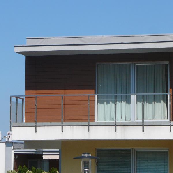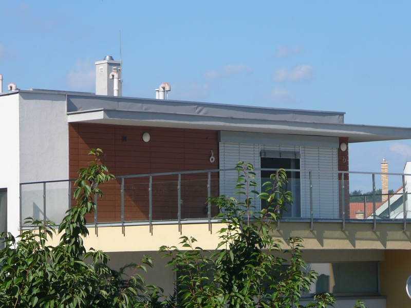 Desky CETRIS Profil Finish RAL 8004 přilepené technologiií Sika TACK Panel jako fasádní obklad v systému VARIO.