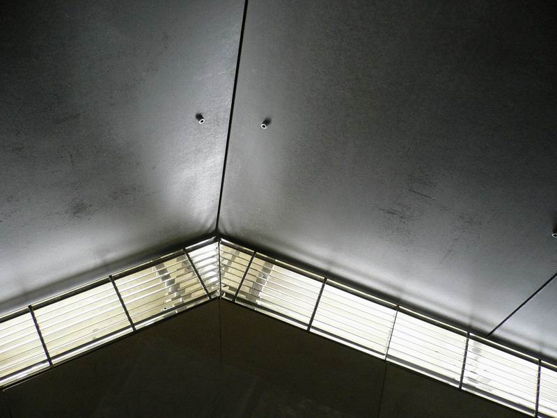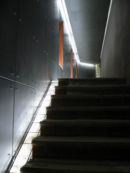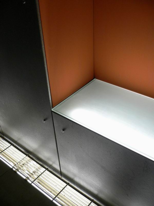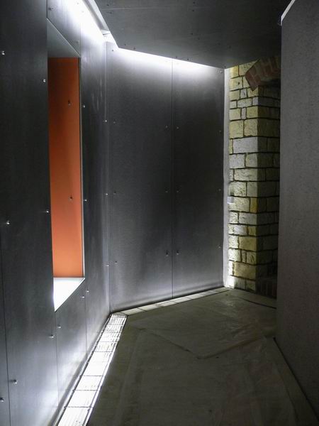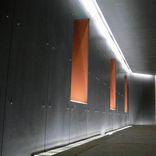 Velice elegantně nasvícený obklad spojovací chodby na Purkrabsví Vyšehrad je vytvořen z desek CETRIS LASUR – tmavě šedý odstín a CETRIS BASIC s cihlově červeným nátěrem (provedeným na stavbě) . Tlouštka desek CETRIS 10 mm a 12 mm s viditelným uchycením desek pomocí chromových imbusových šroubů.